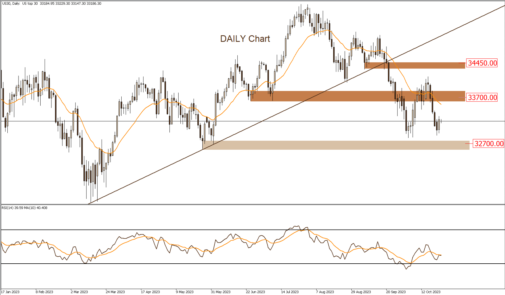 The prices are currently moving in a down-trend on the short term, and as expected, prices have tested support levels in yesterday’s trading session before rebounding. We may once again test the resistance area within the range of 33,700, but this scenario is unlikely to happen if we break through the important support levels within the range of 32,700.