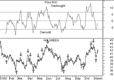 The optimum overbought/oversold levels (e.g., ±6.5) vary depending on the security being analyzed and overall market conditions. I selected ±6.5 by drawing a horizontal line on the chart that isolated previous “extreme” levels of Walgreen’s 12-day ROC.