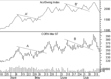 You can see that the breakouts of the price trendlines labeled “A” and “B” were confirmed by breakouts of the Accumulation Swing Index trendlines labeled “A'” and “B’.”