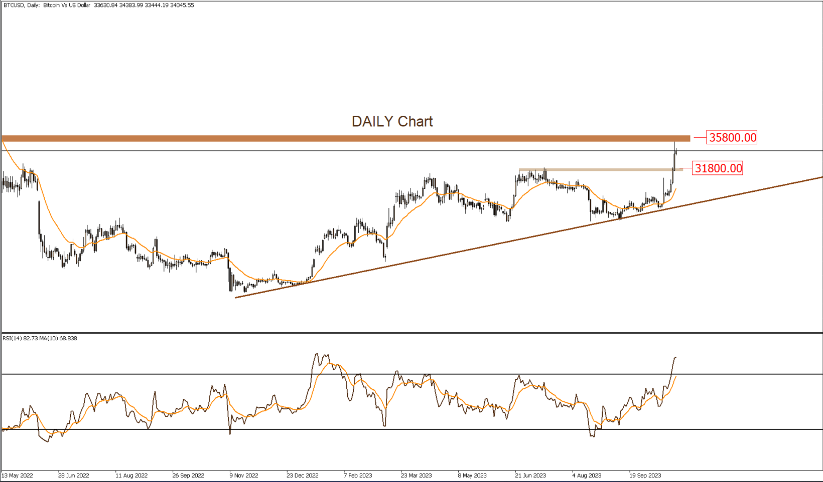 تتداول الأسعار فى إتجاه صاعد على المدى المتوسط و قد إخترقت الأسعار مناطق مقاومة هامة جداً وظهرت القوة الشرائية مع هذا الإختراق حيث صعدت الأسعار بتداولات أمس بوتيره سريعة و قاربت على مناطق مقاومه فى نطاق ال 35800 و التى قد تحد من وتيره الصعود .