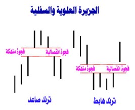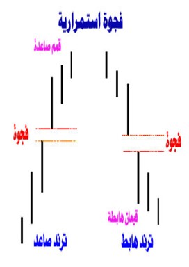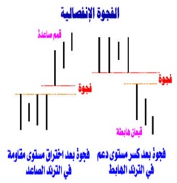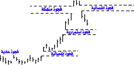 ويمكن تعريف الفجوات بأنها منطقة سعرية بها فراغ في الرسم البياني لم يحدث عليه اي عمليات تداول وهي نوعان اما فجوة للاعلى او فجوة للاسفل , وغالبا الفجوات يتم ملؤها ولكن ليس بالضرورة.