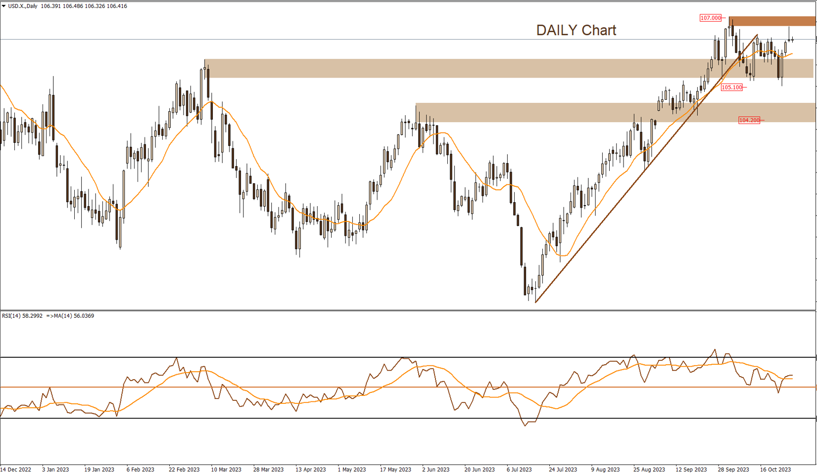 لازالت الأسعار تتحرك فى إتجاه صاعد على المدى القصير و كما كان متوقع إختبرت الأسعار مناطق المقاومة الهامه فى نطاق 107 و من المتوقع هبوط الأسعار مره أخرى والتحرك بين مناطق المقاومة والدعم فى شكل عرضى وينتفى هذا السيناريو مع إختراق منطقه المقاومة السالف ذكرها لأعلى .