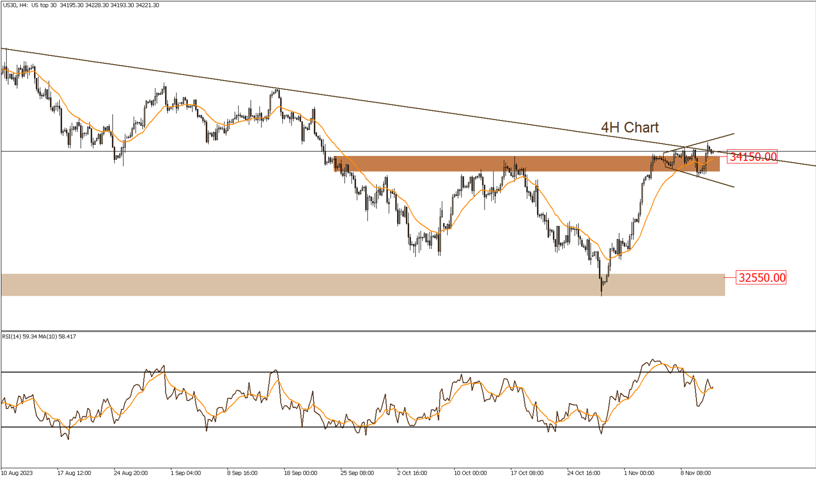 تتداول الأسعار قرب منطقة المقاومه فى نطاق 34150 و من المرجح أن نشهد تذبذبات حاده حول هذه المنطقة، و فى حاله تأكيد إختراق الأسعار لمنطقة المقاومه السالف ذكرها سيشهد المؤشر إرتفاعات قويه و ينتفى هذا السيناريو مع كسر منطقة الدعم الثانوى لأسفل فى نطاق 33850.