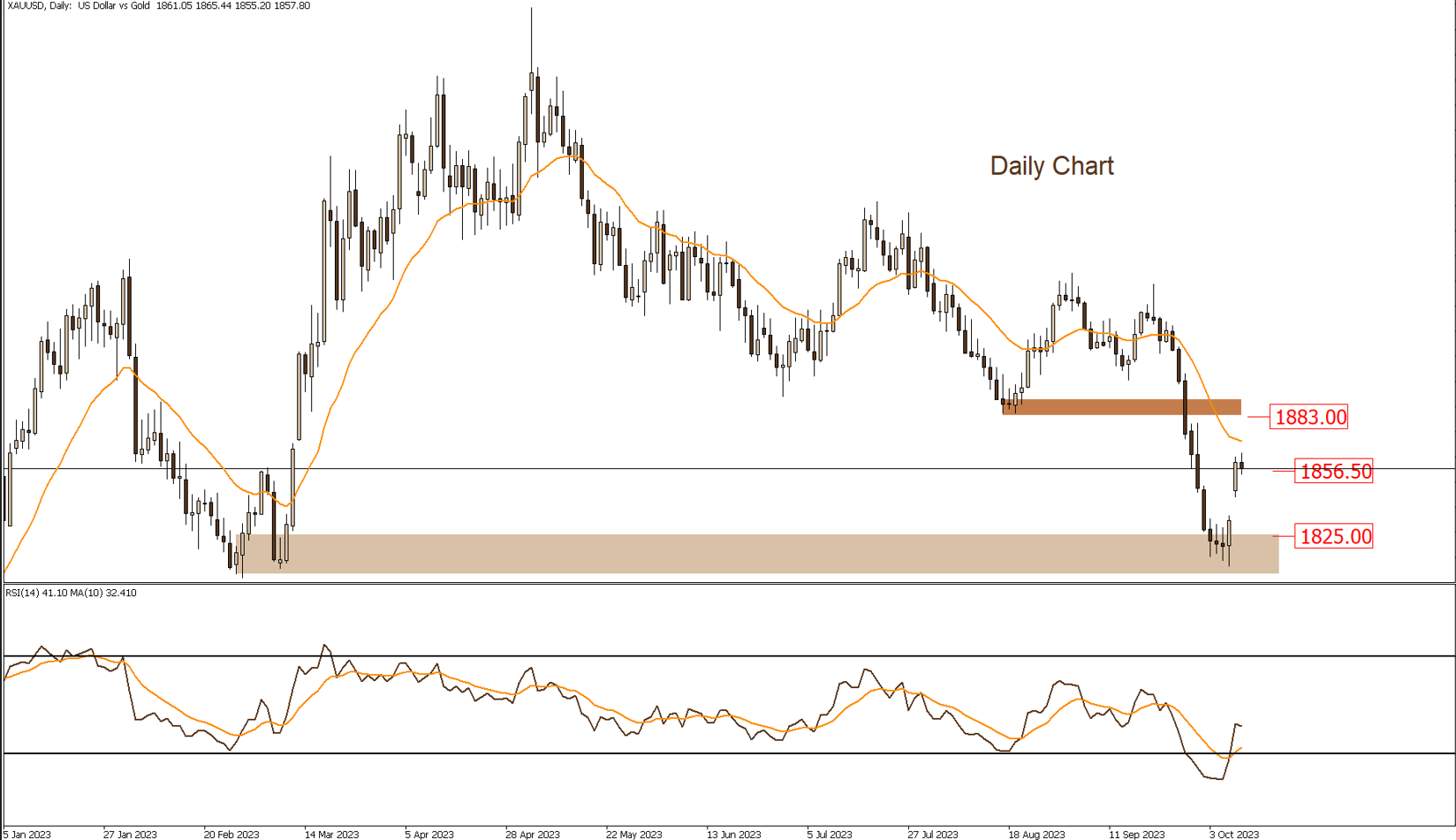 تتحرك الأسعار فى إتجاه هابط على المدى القصير حيث تواجه منطقه دعم فى نطاق 1820-1805 و كما كان متوقعاً ظهرت قوه شرائية فى هذه المنطقة مما أدى الى إرتداد الأسعار لأعلى وفى هذه الحالة قد نختبر منطقه المقاومة السابقة في نطاق 1885.