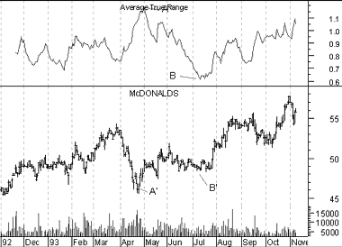 This is a good example of high volatility as prices bottom (points “A” and “A'”) and low volatility as prices consolidate prior to a breakout (points “B” and “B'”).
