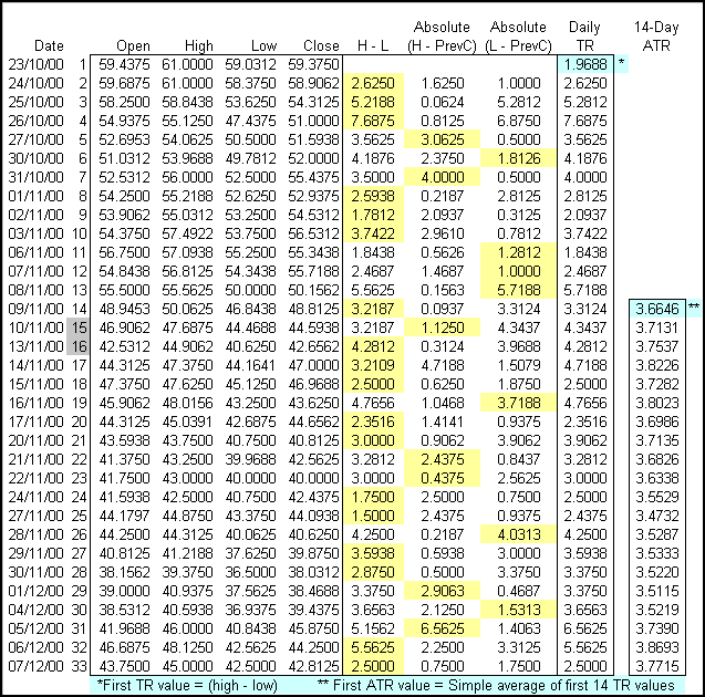 In the Excel spread sheet example above, the first TR value (1.9688) equals the high minus the low. The first 14-day ATR value (3.6646) was calculated by finding the average of first 14 TR values. The second ATR value started the smoothing process by using the previous value.