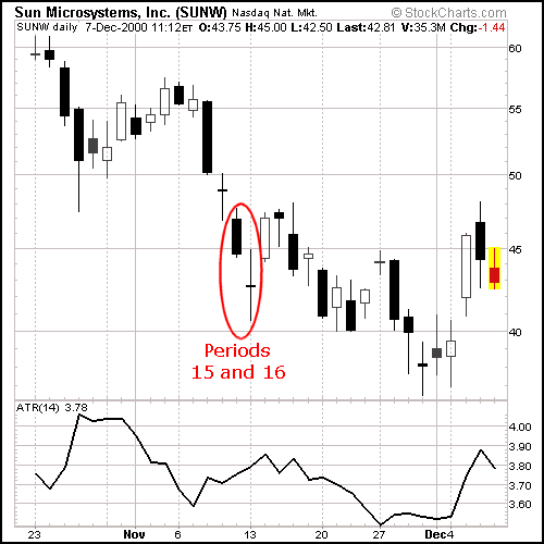 2- A small high/low range formed after a gap down. The TR was found by calculating the absolute value of the difference between the current low and the previous close.