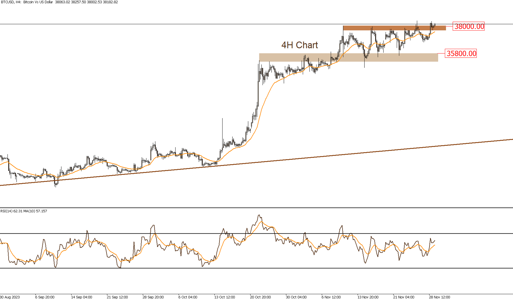 The prices are currently trending upwards on the medium-term, and have successfully broken through the previous important resistance level of 35,800. This breakthrough opens the path to further targets that may reach 40,000. However, in the short term, prices are moving sideways between the support and resistance zones of 38,000 and 35,800 respectively.