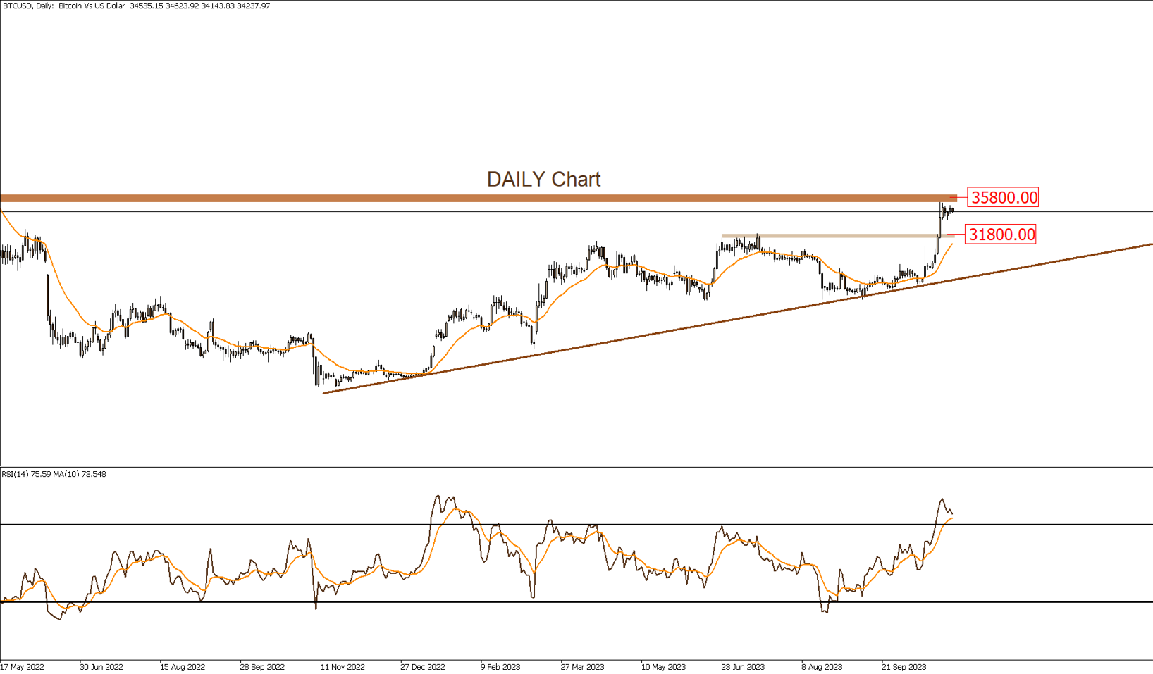 The prices are in uptrend on the medium-term, as they have successfully broken through a key resistance level. With this breakthrough, buyers have shown strength, leading to a rapid increase in prices . Prices are now approaching a resistance zone within the range of 35800, which could potentially slow down the upward momentum.