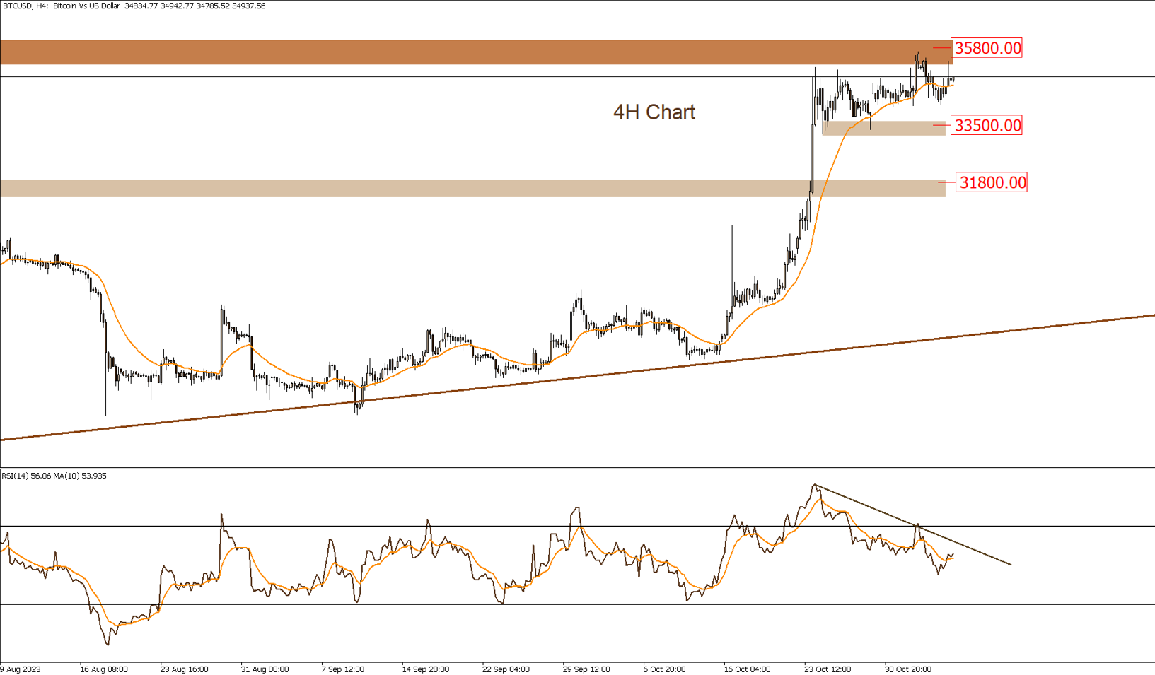 The prices are currently trading in an up- trend, facing a significant resistance zone around 35,800. Recently, there has been a weakness in buying momentum during the last trading sessions. It is expected that prices will move laterally between the support zone at 33,500 and the aforementioned resistance zone in the upcoming sessions, unless there is a breakthrough above 35,800.