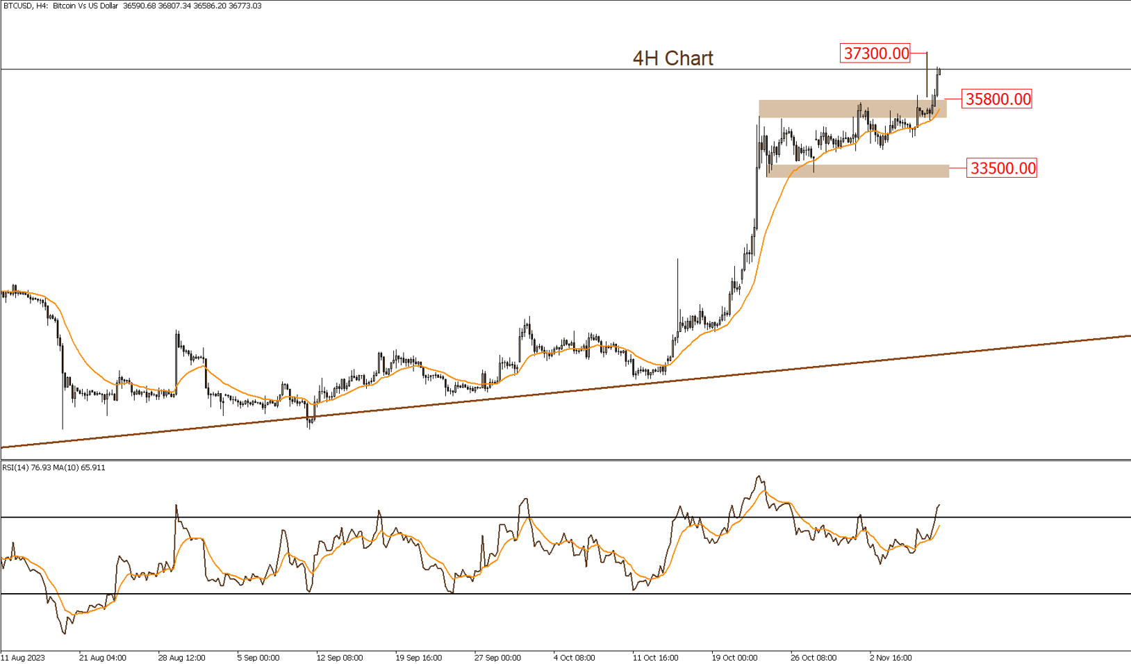 The prices are currently moving in an up-trend in the medium term with a significant breakthrough of the important resistance level at 35,800. This opens the door for potential further targets that could reach as high as 40,000.