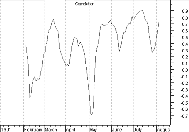 The following chart shows the relationship between corn and live hogs. The high correlation values show that, except during brief periods in February and May, there is a strong relationship between the price of these items (i.e., when the price of corn changes, the price of live hogs also moves in the same direction).