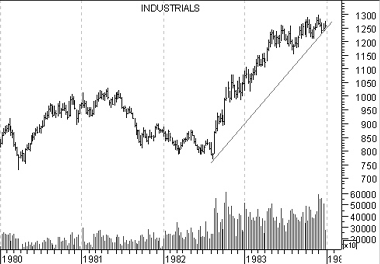 The Dow Theory focuses primarily on price action. Volume is only used to confirm uncertain situations. Volume should expand in the direction of the primary trend. If the primary trend is down, volume should increase during market declines. If the primary trend is up, volume should increase during market advances. The following chart shows expanding volume during an up trend, confirming the primary trend.