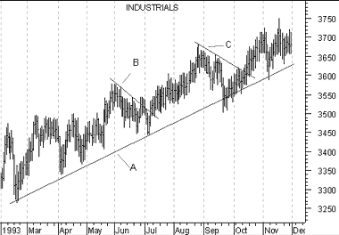 Secondary trends are intermediate, corrective reactions to the Primary trend. These reactions typically last from one to three months and retrace from one-third to two-thirds of the previous Secondary trend. The following chart shows a Primary trend (Line “A”) and two Secondary trends (“B” and “C”).