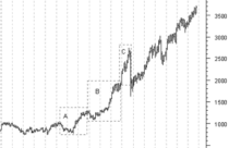 In anticipation of a recovery from the recession, informed investors began to accumulate stock during the First phase (box “A”). A steady stream of improved earnings reports came in during the Second phase (box “B”), causing more investors to buy stock. Euphoria set in during the Third phase (box “C”), as the general public began to aggressively buy stock.