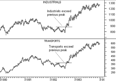 The Industrials and Transports must confirm each other in order for a valid change of trend to occur. Both averages must extend beyond their previous secondary peak (or trough) in order for a change of trend to be confirmed.