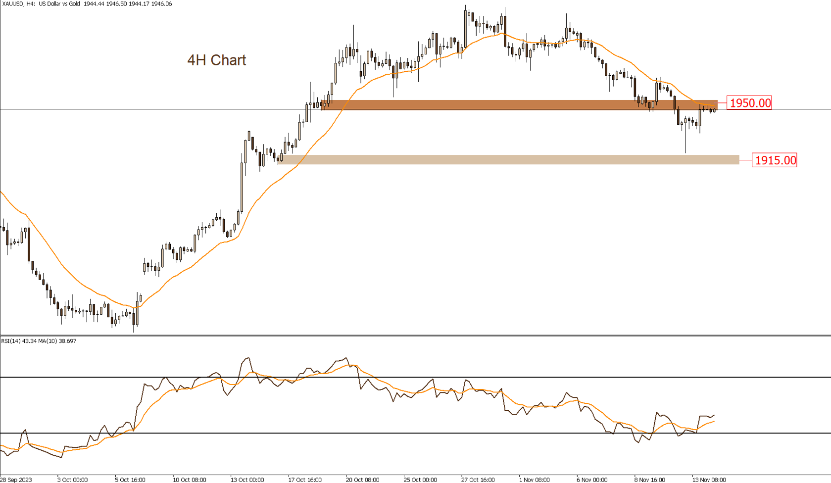 Yesterday, prices experienced a rapid decline, reaching important support levels around 1915. It is expected that we will witness a sideways movement in the upcoming trading sessions between the resistance zone at 1950 and the aforementioned support zone. If we see a breakthrough above the 1953 level, our target could be 1965.