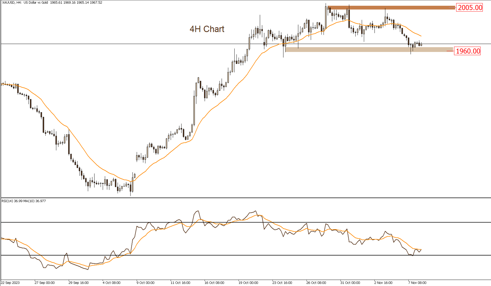 Prices are trading between 2005 and 1960, and it is expected to continue moving within this range during this week’s trading. However, this scenario could change if the previously mentioned support area is broken downwards.
