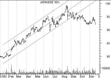 Example : The following chart shows the Japanese Yen with a Linear Regression Channel.