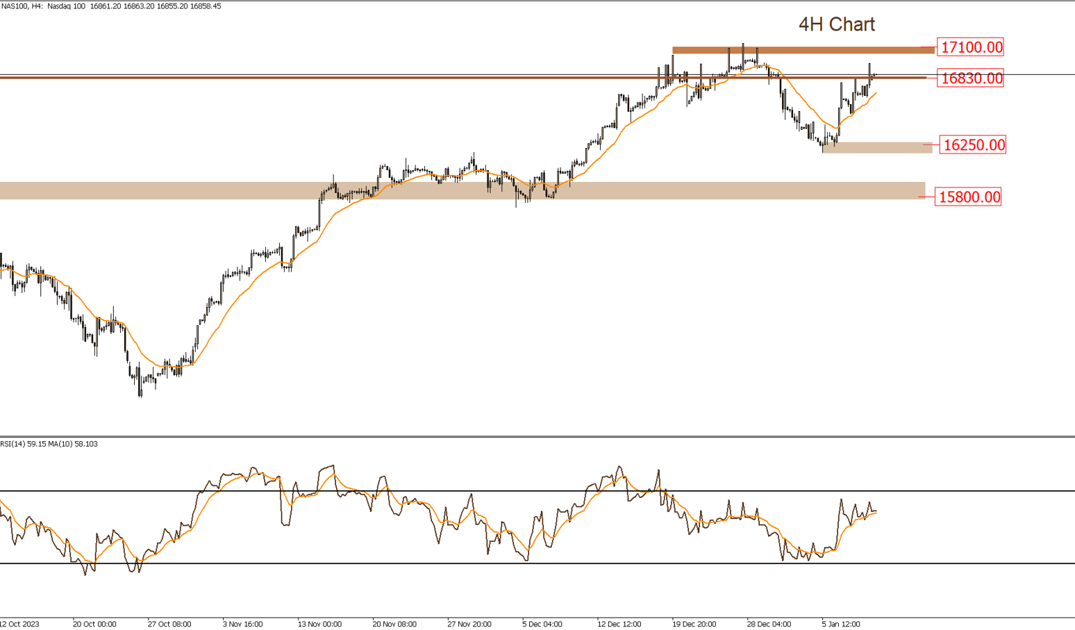 The NASDAQ index is trading within a sideways range in the short term. The area around 16830 represents a resistance zone, and if it is breached, we may target 17100. However, it is likely that this zone will limit the upward movement, and in such a case, prices may retest the support zone around 16250.