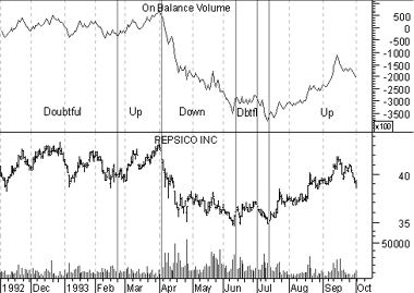 The following chart shows Pepsi and the On Balance Volume indicator. I have labelled the OBV Up, Down, and Doubtful trends.