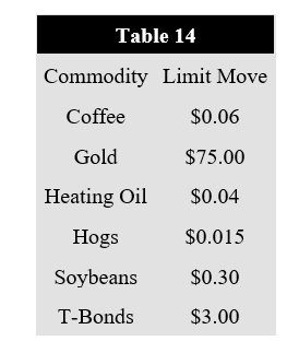 The following table lists the limit moves for several commodities. You can get a list of limit moves from your broker.