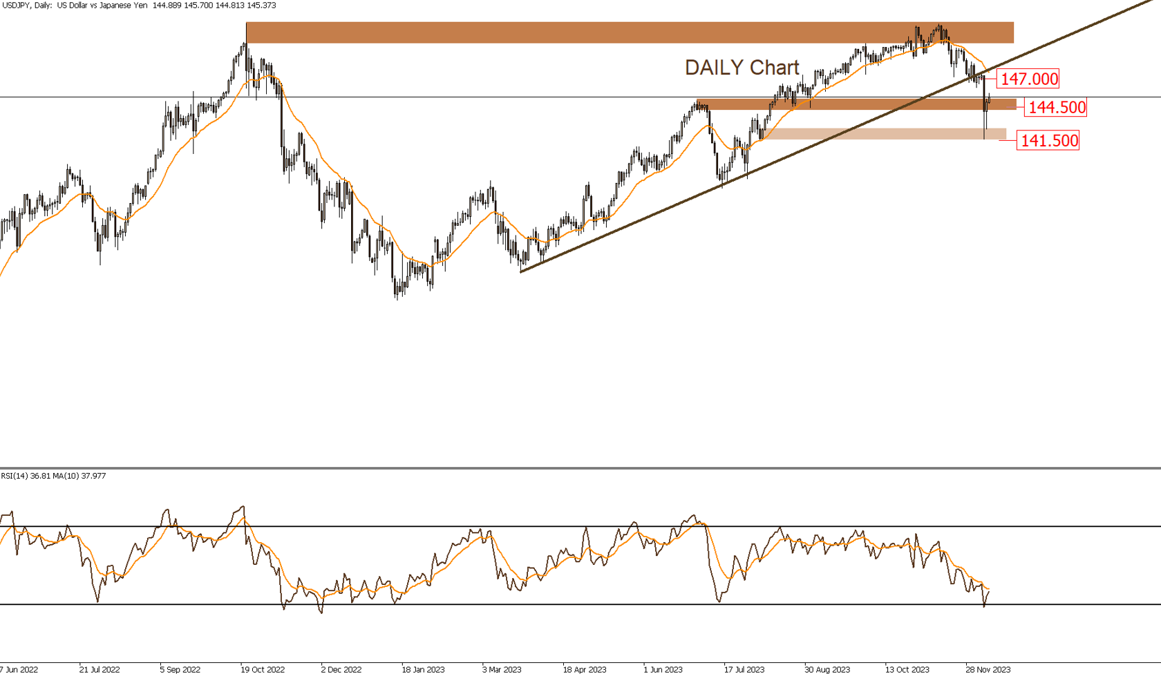 The prices have rebounded from strong support areas within the range of 141.50. Currently, they are trading above the resistance zone at 144.50. If USD/JPY remains stable above these levels, we may target 147. This scenario is negated if the price breaks below 144.50 again.
