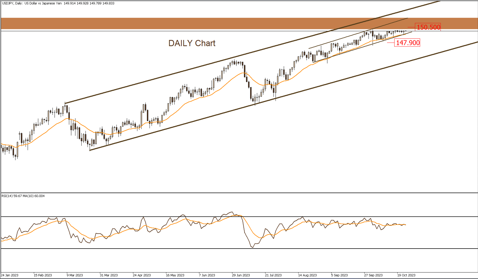 Prices continue to trade within the ascending channel territory, were the upper boundary of the channel matches with a significant resistance area at the 150.50 zone. Prices are facing selling pressure at this level, which is limiting the upward momentum. It is expected that the selling pressure will persist at the aforementioned resistance area until it is successfully breached.