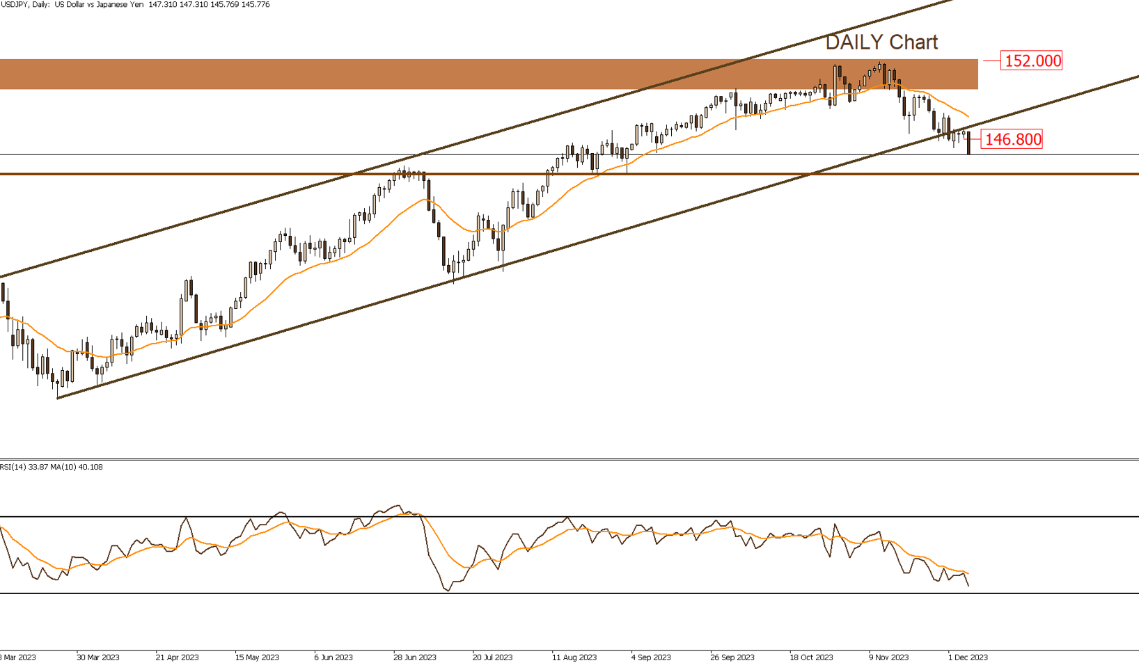 USD-JPY broke the support levels at 147-146.8 downwards. If prices continue to stay below these levels, our target could be 144.50. However, this scenario will be invalidated if the prices rise again above 147.