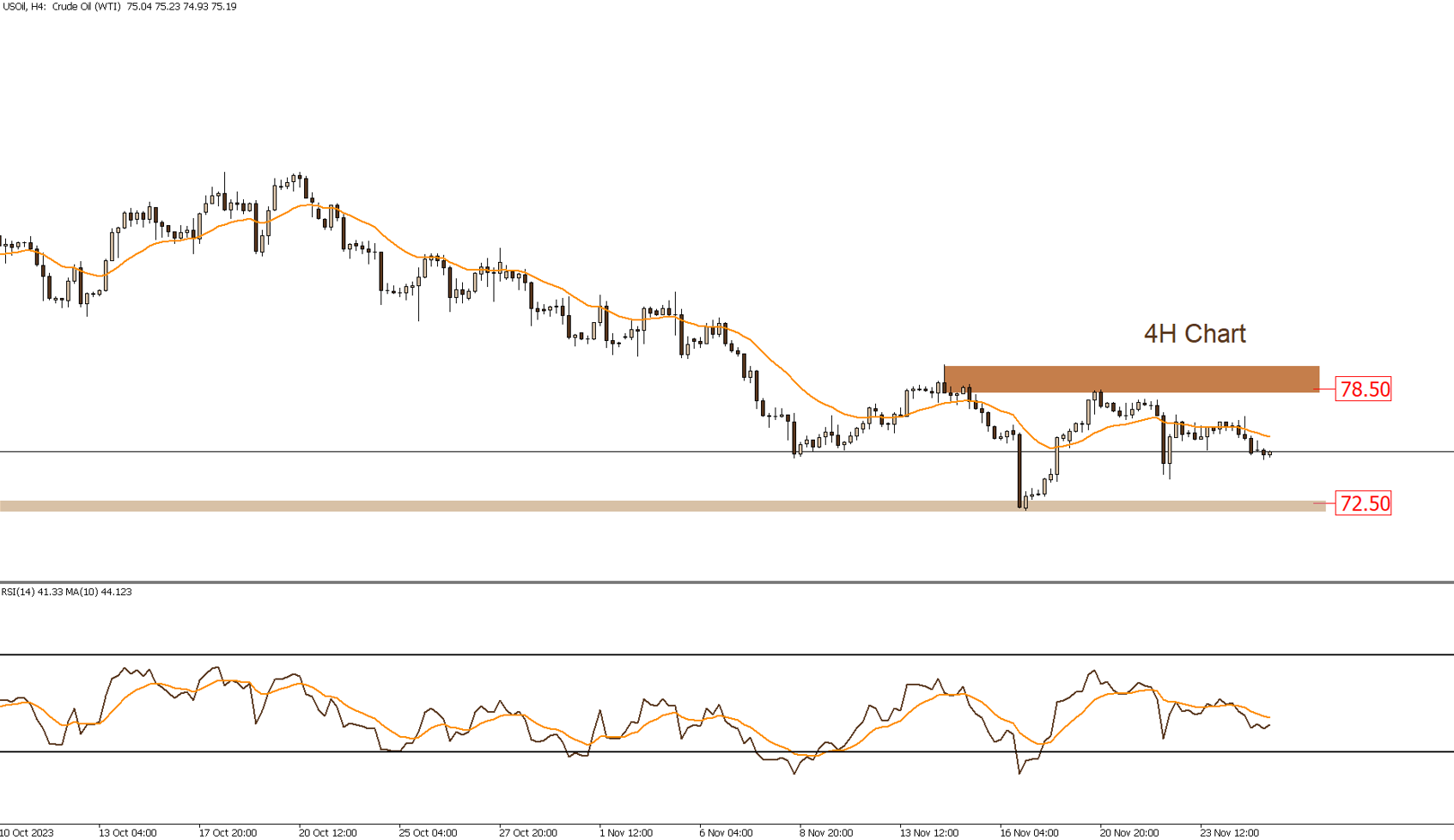 The prices in yesterday’s trading session dipped but quickly rebounded before reaching the support zone at $72.50. If the prices manage to break through the $78.5-$80 resistance levels, it could signal a potential shift in the short-term trend to the upside. However, it is unlikely that breaking through these resistance levels will be easy.