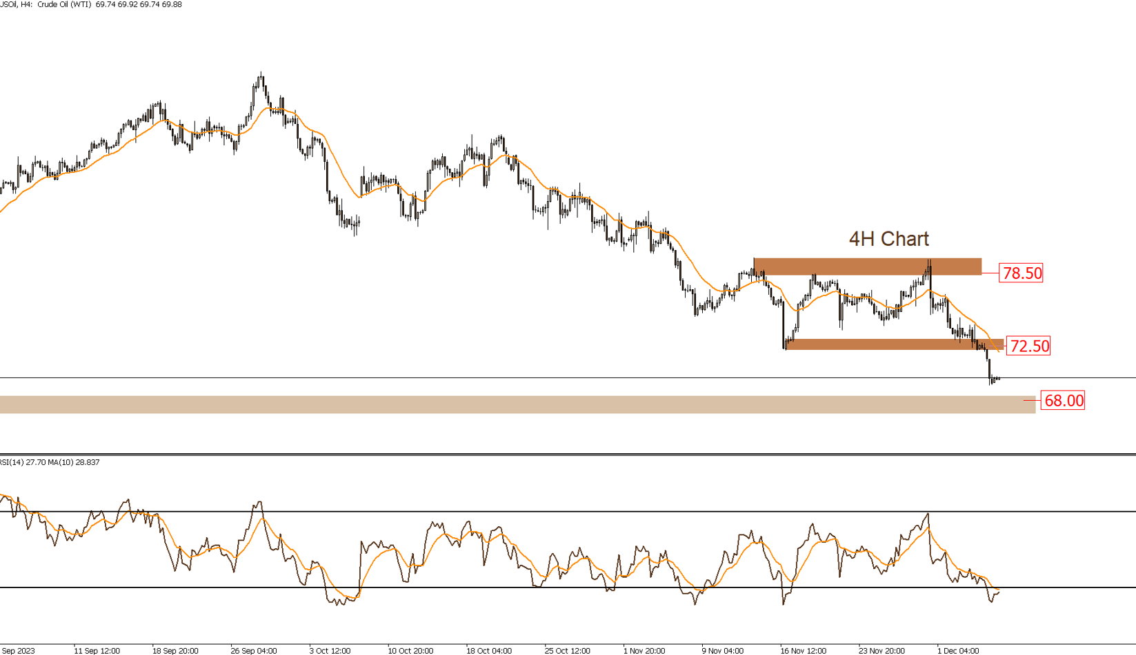 Oil prices broke below the significant support level at $72.5 indicates a potential target of $68. However, this scenario would be nullified if prices once again rise above $72.